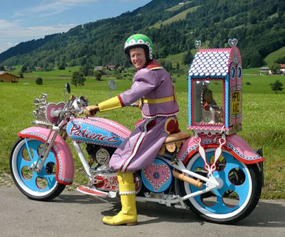 すりきれた50歳のテディ・ベアとアーティストのバイク巡礼、この展覧会はそこから始まります。おとぎの国の乗り物のような改造バイクの背には小さな祭殿が備えられ、中にテディ・ベアがローマ皇帝のように腰掛けています。運転するのは、ライラック色のキュートなコスチュームに身を包むアーティスト。